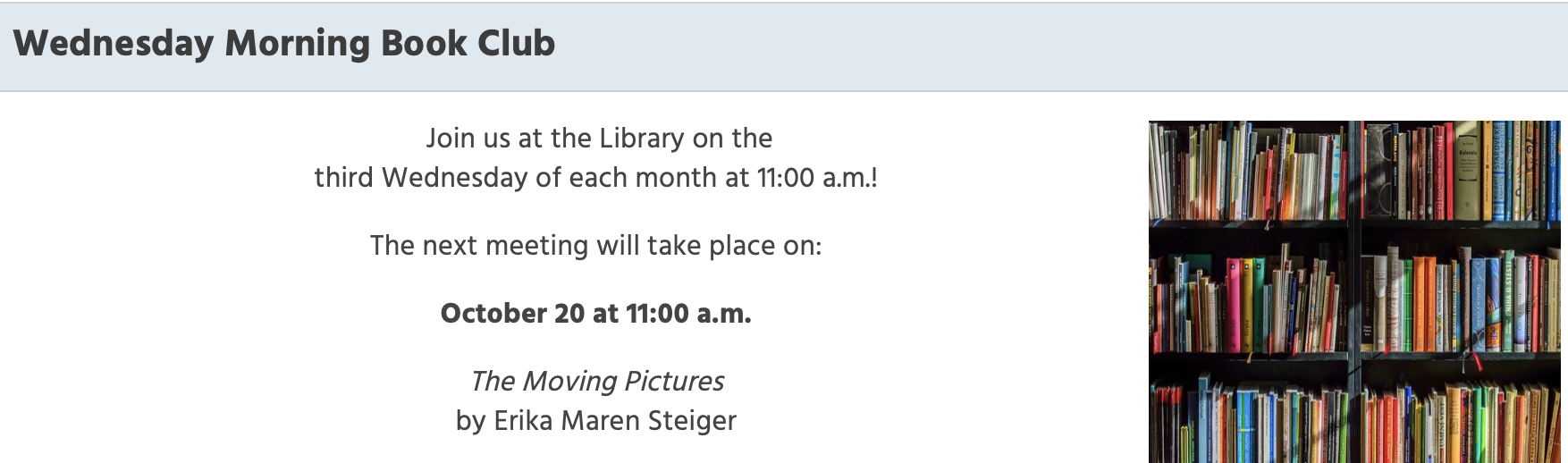 I am very excited to announce that my book The Moving Pictures has been chosen as the October selection for my local library’s book club! I am an enormous fan of libraries. They are crucial institutions for communities everywhere, and they should be more appreciated and better funded. Book clubs are just one of the many ways they invite people in and connect them together. I am especially pleased that my book gets to be part of that.
